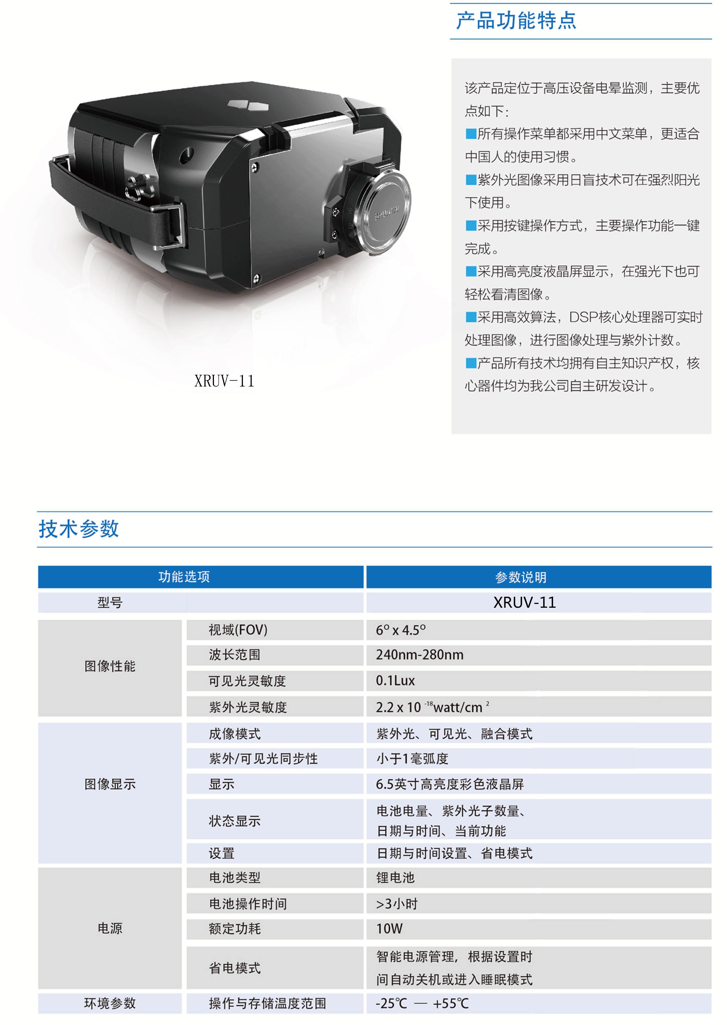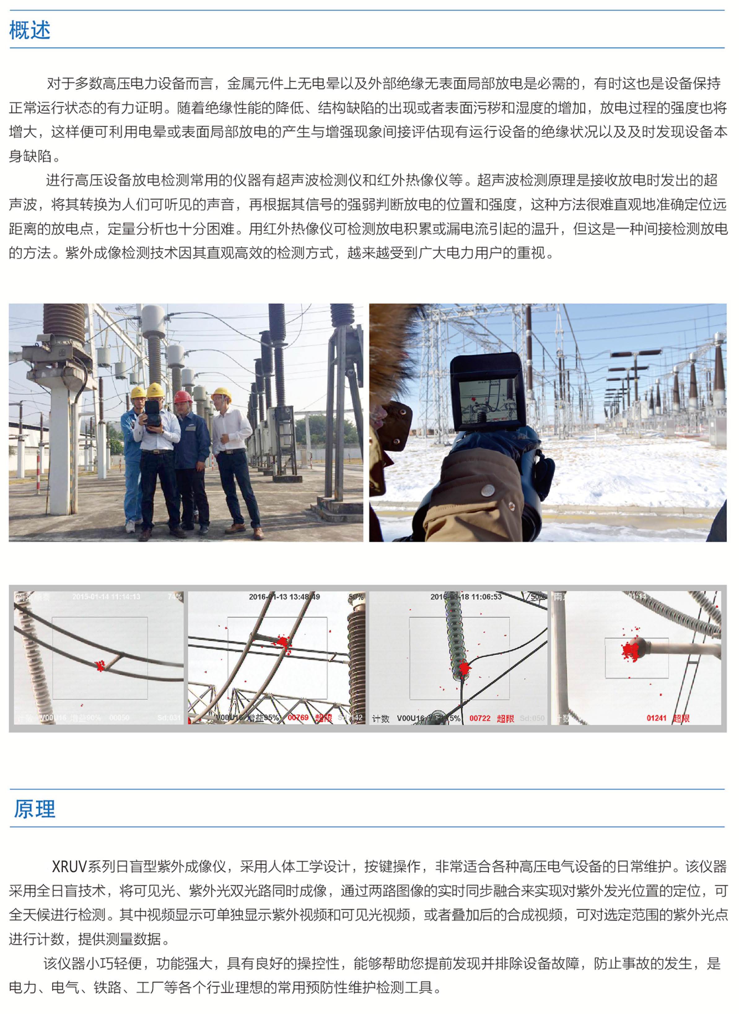 XRUV-11产品定位于高压设备电晕监测,该仪器采用日盲型技术,可在强烈阳光下使用;采用按键操作方式,主要操作功能一键完成;采用中文菜单,高亮度液晶屏显示,在强光下也可轻松看清图像。该仪器小巧轻便,功能强大,具有良好的可操控性,能够帮助您提前发现并排除设备故障,防止事故的发生,是电力、电气、铁路、工厂等各个行业理想的常用预防性维护检测工具。
